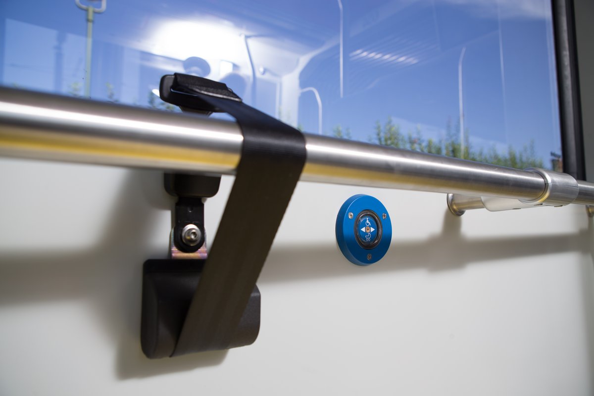 There is a blue button in the space for wheelchairs and on the right handrail in the entrance area. Press this to indicate your desired stop.