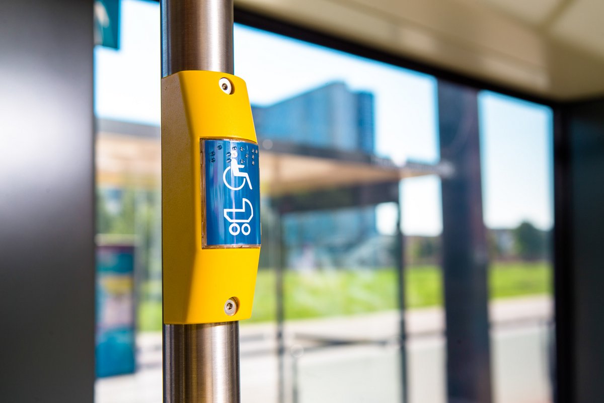 These are located directly opposite the entrance and are marked from outside with the corresponding pictographs. During your journey, position your wheelchair counter to the direction of travel beside the last row of seats and apply the parking brake.