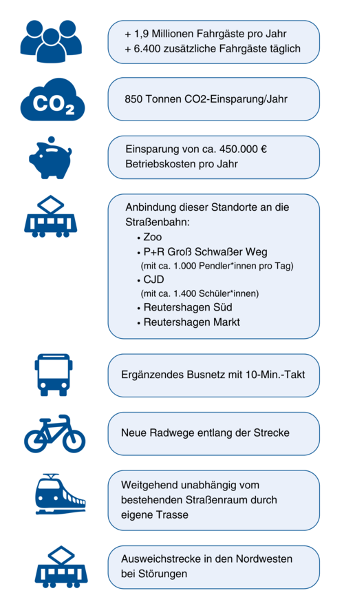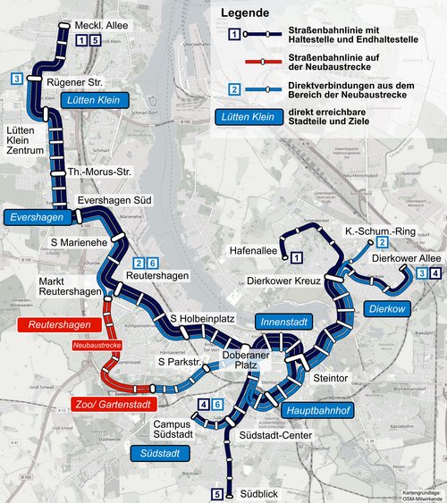 Durch einen attraktiven 10-Minuten-Takt sowie Direktanbindungen in Richtung Doberaner Platz, Hauptbahnhof und neu nach Reutershagen besteht hier zukünftig ein hochwertiges Angebot, das mehr Fahrtmöglichkeiten bietet als das heutige Netz.