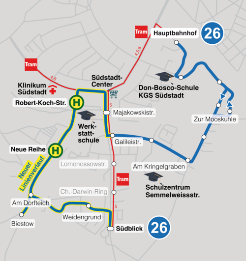 Die Linie 26 wird künftig ab Südblick über Weidengrund, Biestow, Robert-Koch-Straße, Majakowskistraße, Am Kringelgraben und Dieselmotorenwerk bis zum Hauptbahnhof Süd fahren.