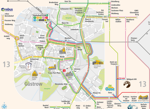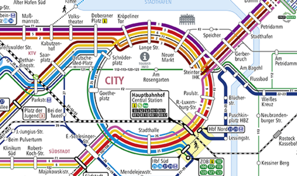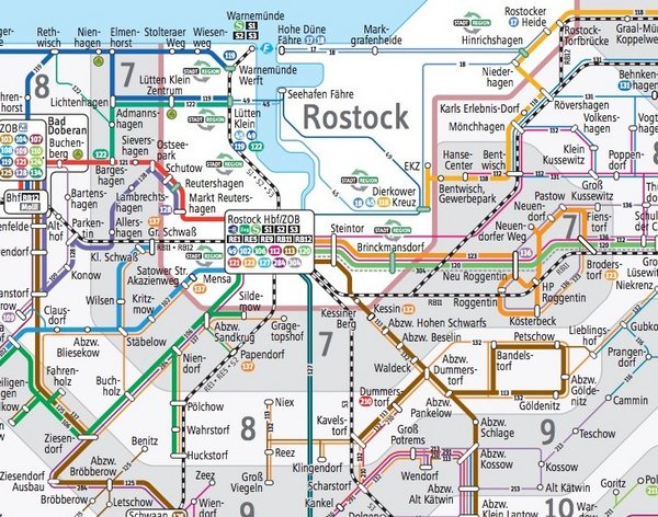 Auf den Liniennetzplänen sind alle Linien und Haltestellen in Rostock bzw. im Umland sowie die Tarifzonen für Rostock und die Region abgebildet.