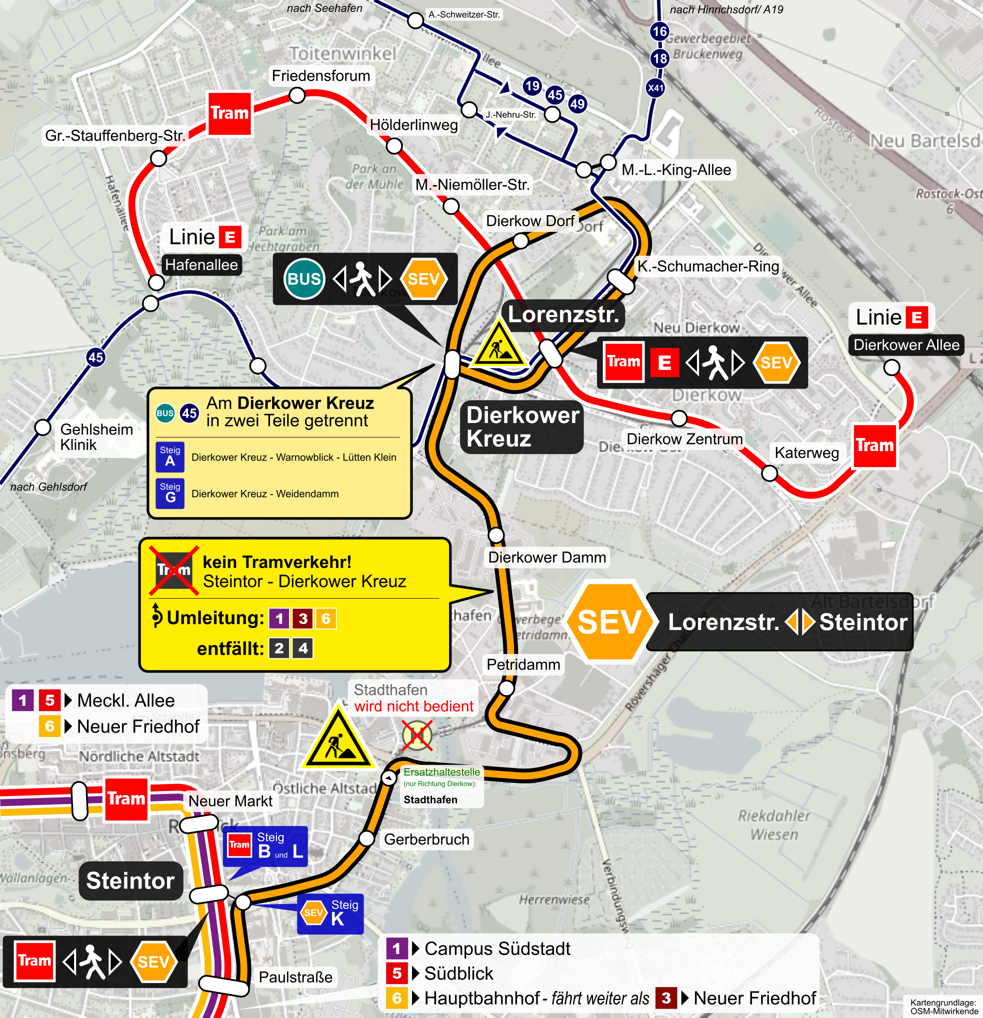 Die Straßenbahnlinien 1, 3, 6 fahren in geänderter Linienführung, die Linie 5 fährt unverändert, die Linien 2 und 4 entfallen. Zusätzlich fährt in Dierkow und Toitenwinkel die Straßenbahnlinie E und pendelt zwischen Hafenallee und Dierkower Allee. Zwischen Steintor und Dierkower Kreuz erfolgt ein Ersatzverkehr mit Bussen.