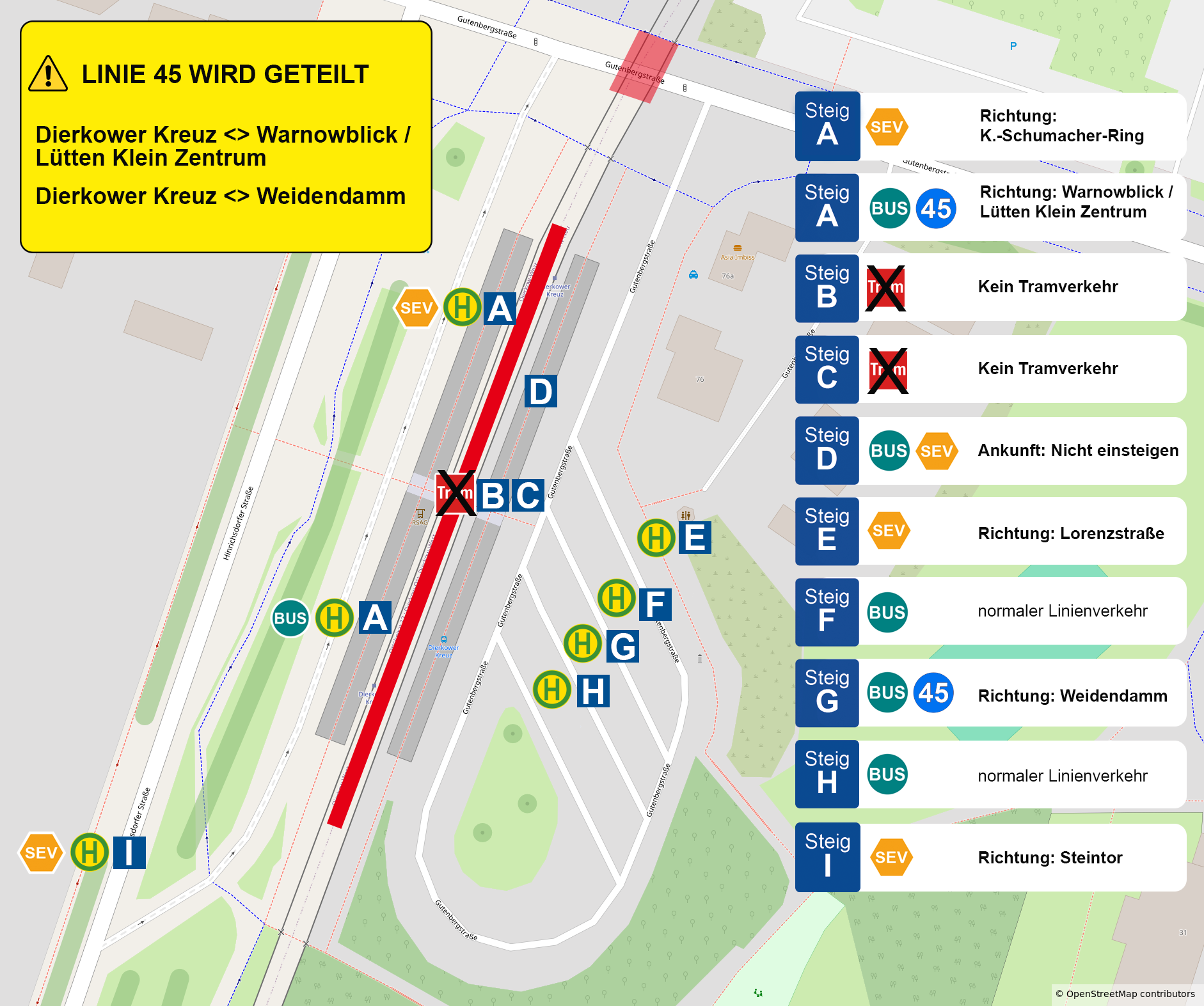 Auf Grund der Sperrung der Überfahrt Gutenbergstraße muss die Linie 45 in zwei Teilabschnitte geteilt werden.