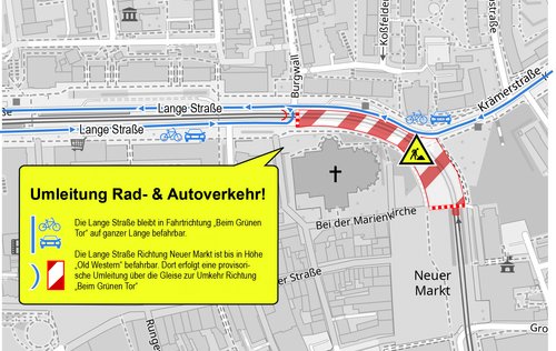 In Richtung Krämerstraße ist die Lange Straße bis in Höhe des Restaurants “Old Western" befahrbar. Dort erfolgt eine provisorische Überleitung über die Gleise zur Umkehr Richtung “Beim Grünen Tor”. Das heißt, die Parkplätze und Parkhäuser auf dieser Seite der Langen Straße sind ebenfalls weiterhin nutzbar.