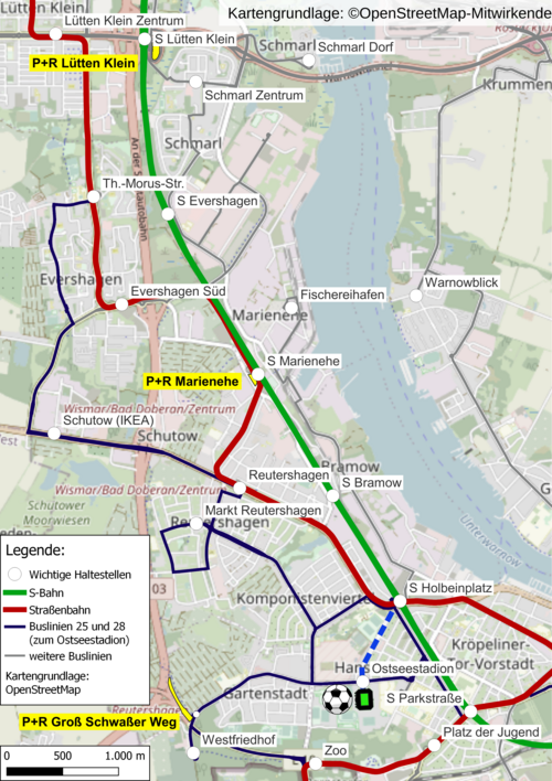 Vom S-Bahnhof Lütten Klein fahren Sie mit der S-Bahn zur Haltestelle Holbeinplatz. Der Fußweg zum Ostseestadion beträgt ca. 10 Minuten.