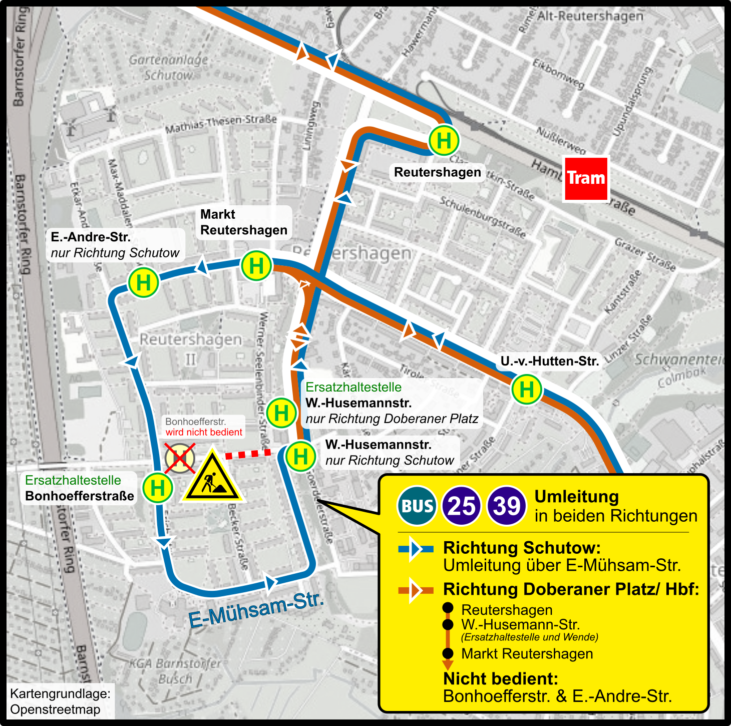 In Richtung Lütten Klein/ Thomas-Morus-Straße fahren die Linie 25 und 39 ab E-André-Straße über die E-Mühsam-Straße. Die Haltestelle Bonhoefferstraße entfällt. Eine Ersatzhaltestelle wird in der E-Mühsam-Straße eingerichtet. Die Ersatzhaltestelle ist nicht mobilitätsgerecht ausgebaut.