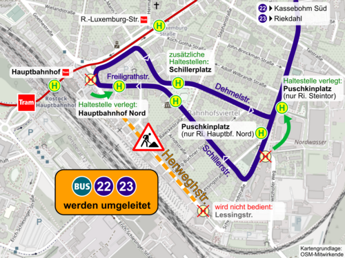Die Linien 22 und 23 starten und enden an der Ersatzhaltestelle Hauptbahnhof Nord und fahren über die Ersatzhaltestelle Schillerplatz zum Puschkinplatz, weiter zur Blücherstraße und ab hier weiter in gewohnter Linienführung.