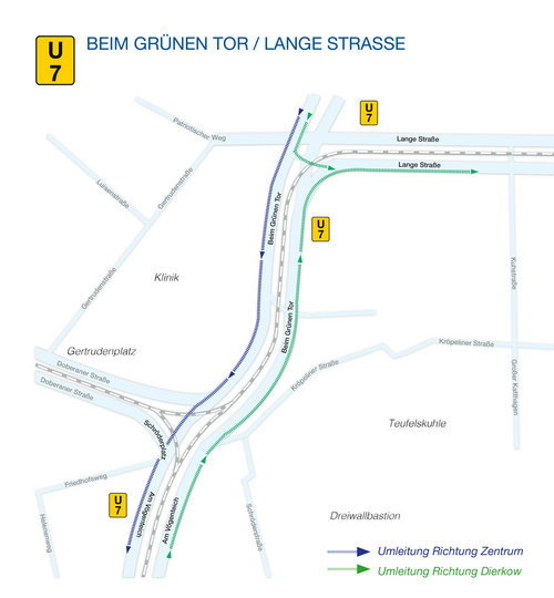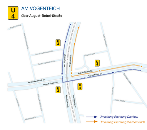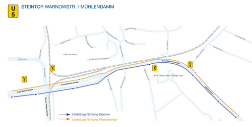 - Dierkower Damm <> Vorpommernbrücke (Warnowstraße bleibt offen, jedoch nur über Dierkower Damm zu erreichen