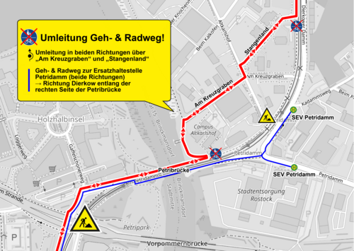 Aufgrund von zusätzlichen Gleiserneuerungen zwischen der Petribrücke und Am Kreuzgraben ist der Geh- und Radweg während der Baumaßnahme in diesem Bereich voll gesperrt. Bitte nutzen Sie alternativ den Weg durch das Gewerbegebiet über die Straßen Am Kreuzgraben und Stangenland.