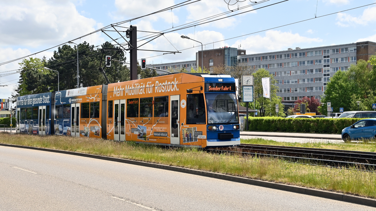 Unter dem gemeinsamen Motto „Bahn frei für eine gesunde Stadt – Mehr Mobilität für Rostock!“ ist die blau-orangefarbene Straßenbahn nun als Botschafterin auf den Straßen der Hansestadt unterwegs.