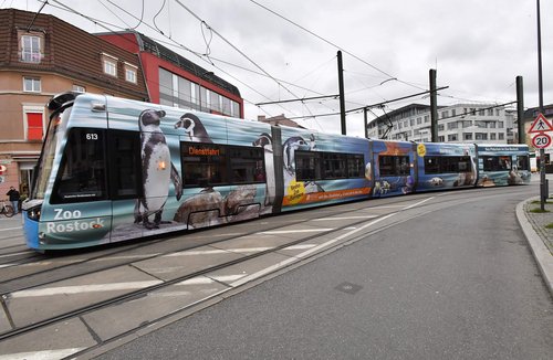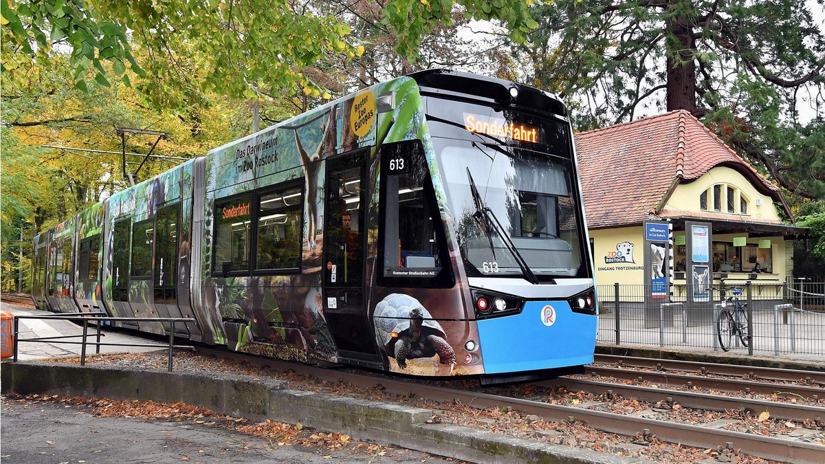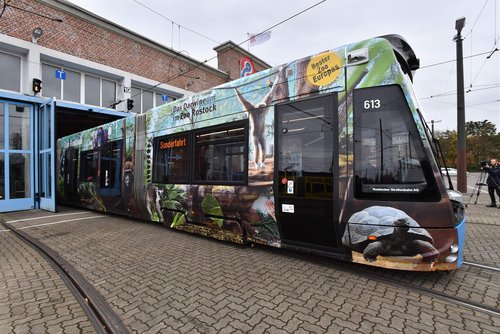 Die neue Bahn überrascht die Rostockerinnen und Rostocker mit 2 Seiten. Auf der einen Seite tummeln sich die Bewohner des Polariums am und im Wasser. Auf der anderen Seite gibt es die grünen und tropischen Regionen des Rostocker Zoos zu sehen. Orang-Utans, Gorillas, Brazzameerkatzen, Kattas, Flamingos, Baumkängurus, Riesenschildkröten und ein Krokodil machen das Fahrzeug zu einem richtigen Hingucker im Stadtbild der Hansestadt.