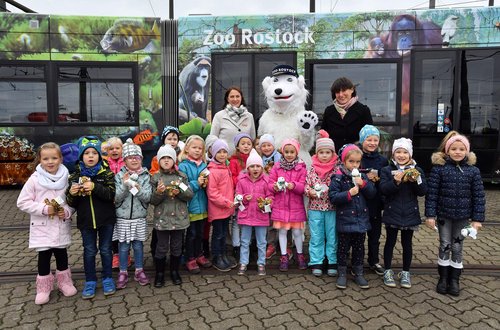 Zookuratorin Antje Zimmermann und die Kaufmännische RSAG-Vorständin Yvette Hartmann haben offiziell die neue Zoo-Straßenbahn vorgestellt. Der neue Hingucker wirbt für das im September eröffnete Polarium, die neue Heimstätte der Eisbären und Pinguine. Kinder der Kita am Schwanenteich durften als erstes eine Probefahrt zum Zoo unternehmen.
