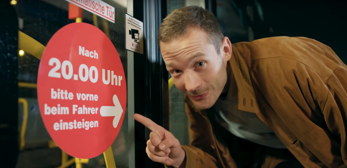 Für alle Fahrgäste gilt: Ab 20 Uhr steigen Sie in unseren Bussen vorn ein und zeigen Sie bitte unaufgefordert Ihren Fahrschein vor. So kann der Fahrer besser sehen, wer mitfährt.