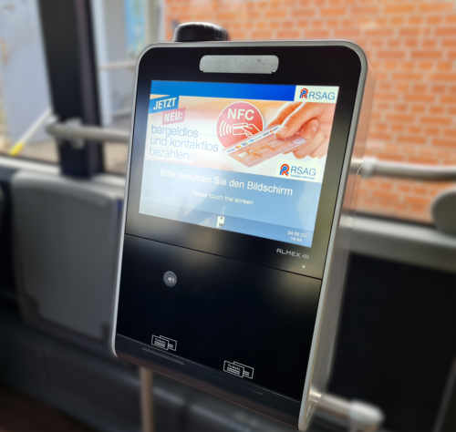 Alle Normal- und Gelenkbusse sowie alle Straßenbahnen fahren mit einem Automaten an Bord. Sie finden die Automaten an der zweiten Einstiegstür.