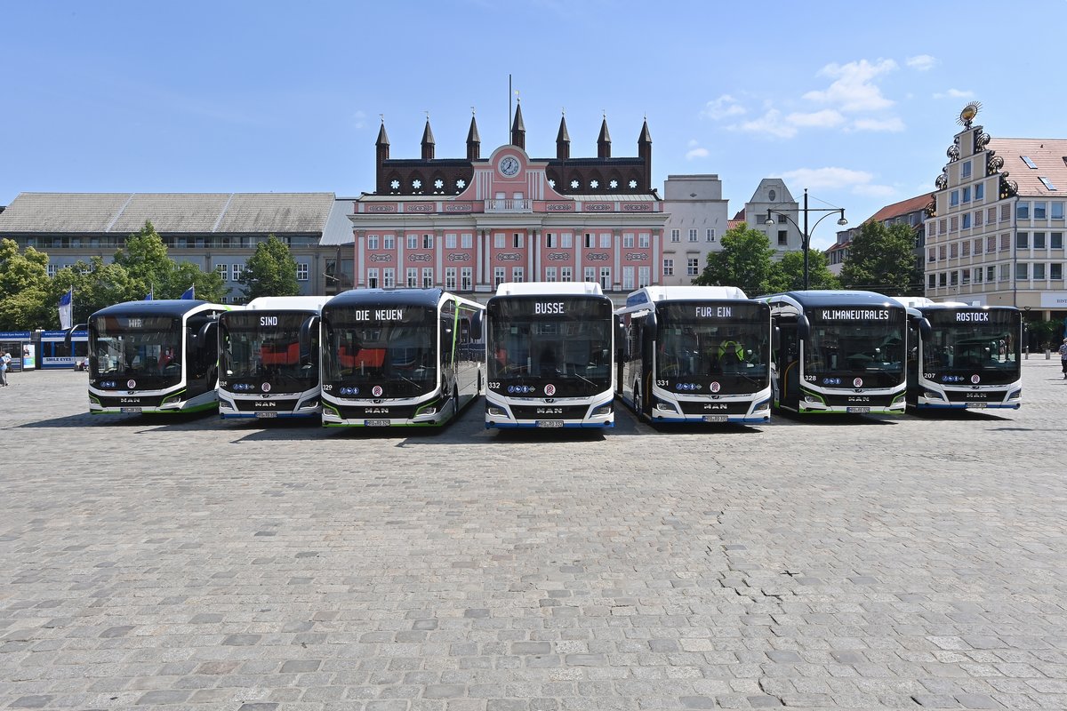 Die Rostocker Straßenbahn AG investiert in eine klimafreundliche Busflotte und startet die Antriebswende mit 15 neuen Fahrzeugen: Gemeinsam mit Rostocks Oberbürgermeisterin Eva-Maria Kröger und vielen weiteren Gästen wurden sieben von insgesamt 15 neuen Busse mit alternativen Antrieben direkt vor dem Rathaus symbolisch an den Fahrdienst übergeben. Erstmals kommen in der Hanse- und Universitätsstadt Rostock zehn neue Biomethan-Busse des Herstellers MAN zum Einsatz. Fünf neue Elektro-Busse von MAN ergänzen zudem die E-Busflotte der RSAG.