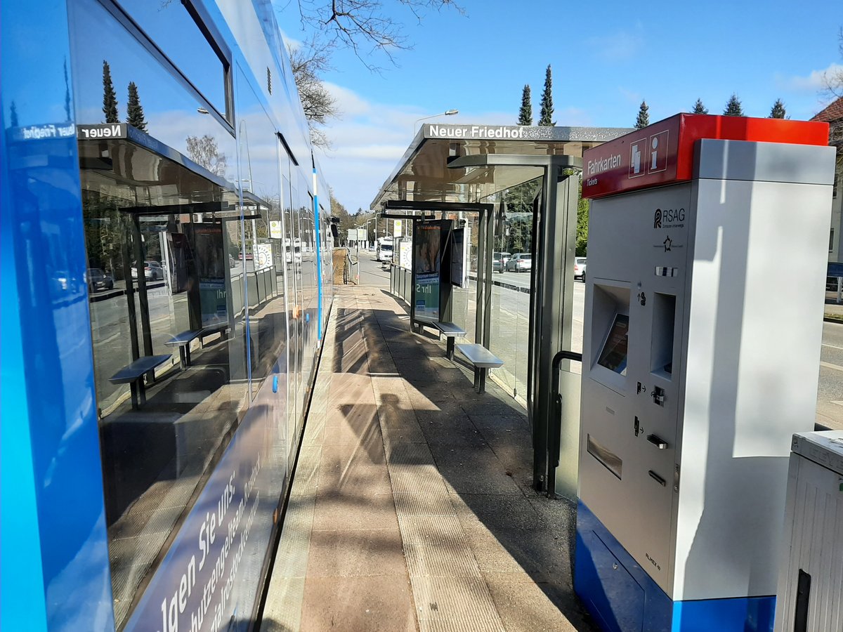Ab sofort können Fahrgäste an der Haltestelle Neuer Friedhof wieder einen stationären Ticketautomaten nutzen. Hier sind alle Ticketsorten für alle Zonen und auch Fahrkarten im Vorverkauf erhältlich. Der Kauf kann mit Bargeld oder bargeldlos erfolgen. Akzeptiert werden Girocard (EC-Karte), Kreditkarte (VISA, MasterCard, JCB und Diners Club), beides nutzbar mit Eingabe der PIN oder auch kontaktlos.