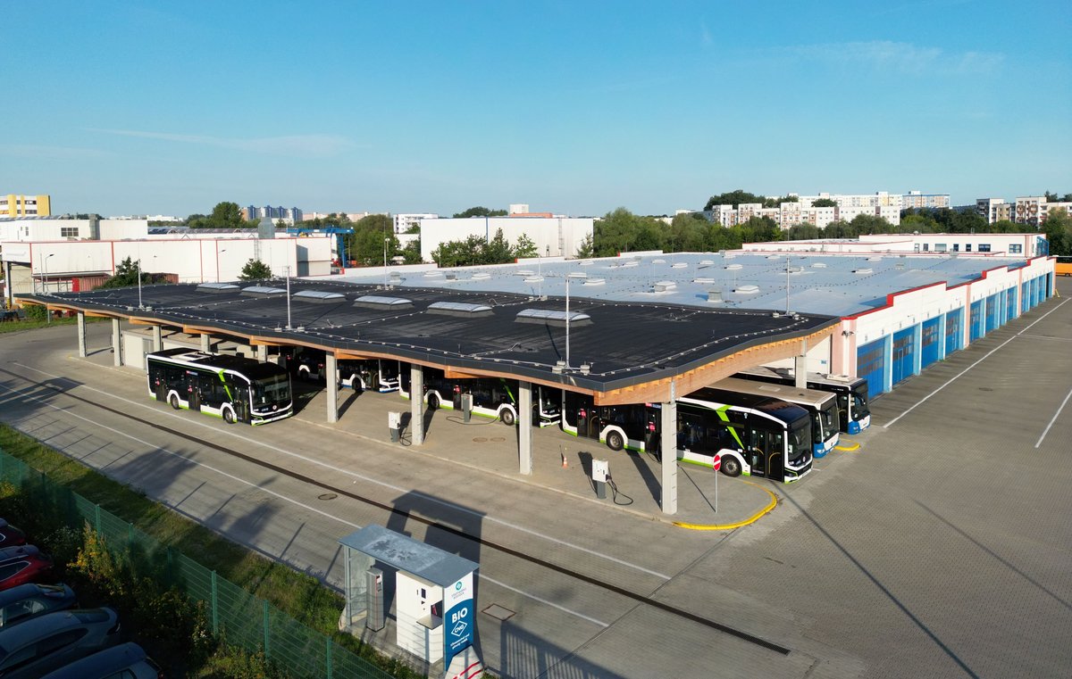 Seit vielen Jahren arbeitet die RSAG daran, die Treibhausgase ihres Fuhrparks weiter zu senken. Seit 2023 werden beispielsweise keine Dieselbusse mehr gekauft. Stattdessen setzt die RSAG auf saubere und emissionsfreie Antriebstechniken wie Biomethangas und Elektroenergie. Bereits im Jahr 2027 wird mehr als die Hälfte der von der RSAG eingesetzten Busse mit grüner Antriebstechnologie – also Biomethan und Elektro – unterwegs sein. Dafür wurde im vergangenen Jahr auf dem Busbetriebshof Rostock-Schmarl die entsprechende Infrastruktur zum Laden und Tanken errichtet. Als letzter Schritt wurde ein großes Carportdach installiert, so dass die Busse draußen auch trocken stehen. Aktuell beherbergt der RSAG-Busbetriebshof rund 90 Busse.