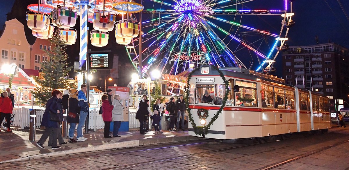 Vom Südblick geht es Richtung Lange Straße und direkt zum Rostocker Weihnachtsmarkt. Die historische Bahn fährt über den Hauptbahnhof und ist eine weitere Runde auf dem Stadtring unterwegs. Zwischendurch fährt die Bahn zum Südblick zurück und von dort wieder Richtung Innenstadt.